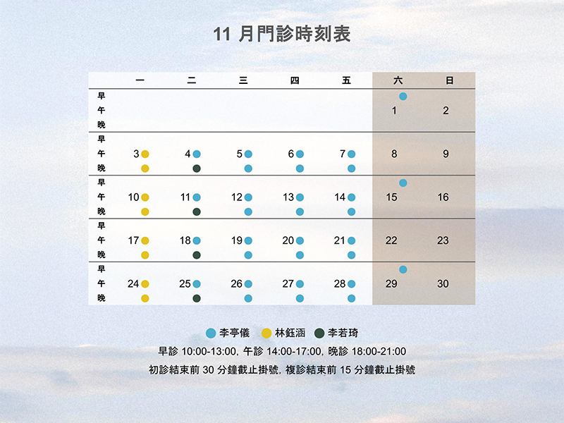 | 晚診 18-21 | 林鈺涵 | 李若琦 | 李亭儀 | 李亭儀 | 李亭儀 | 休診 |