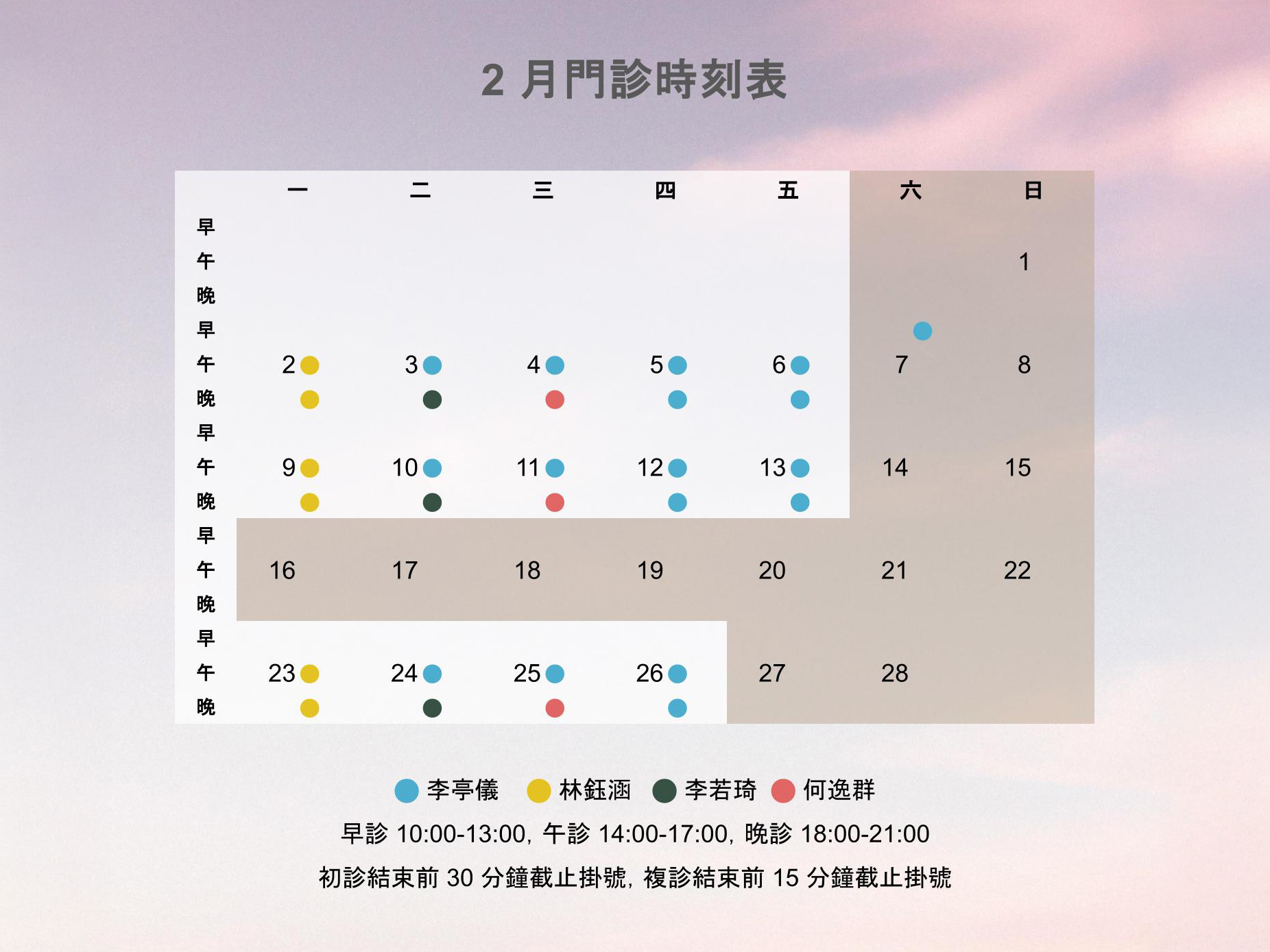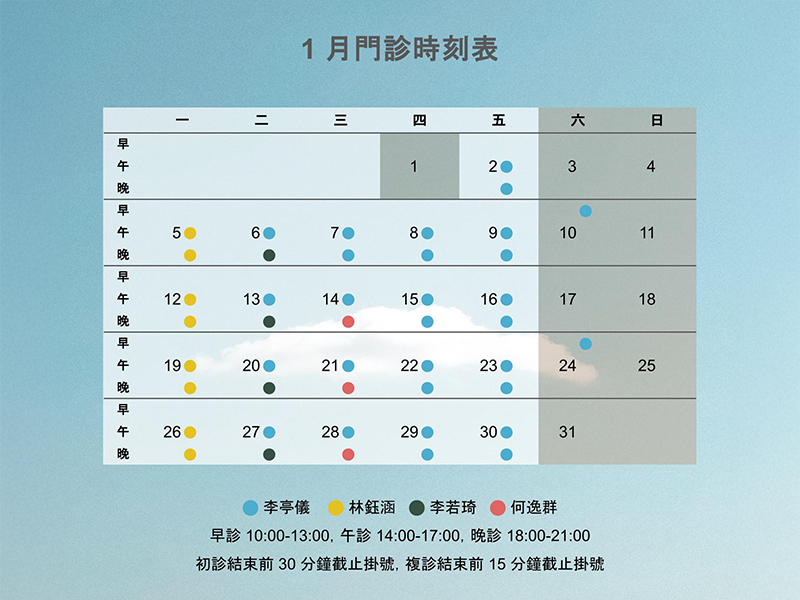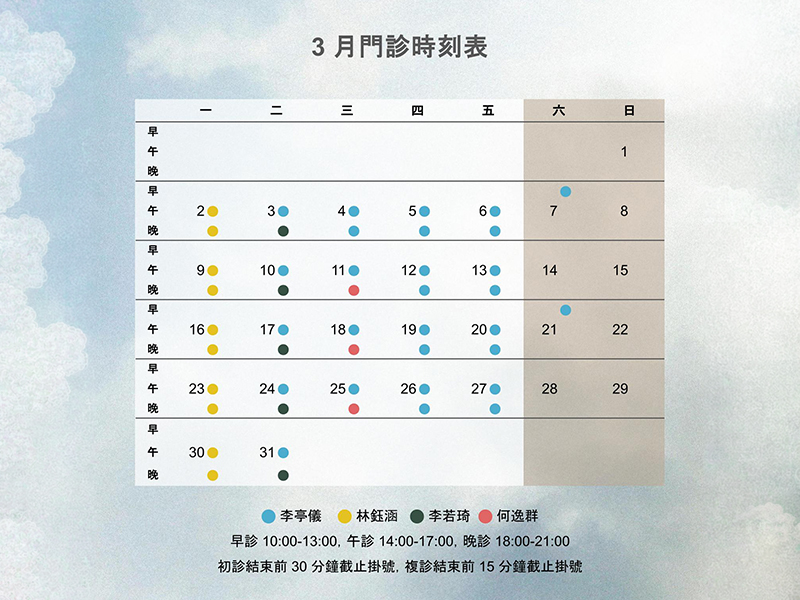 | 晚診 18-21 | 林鈺涵 | 李若琦 | 何逸群 | 李亭儀 | 李亭儀 | 休診 |