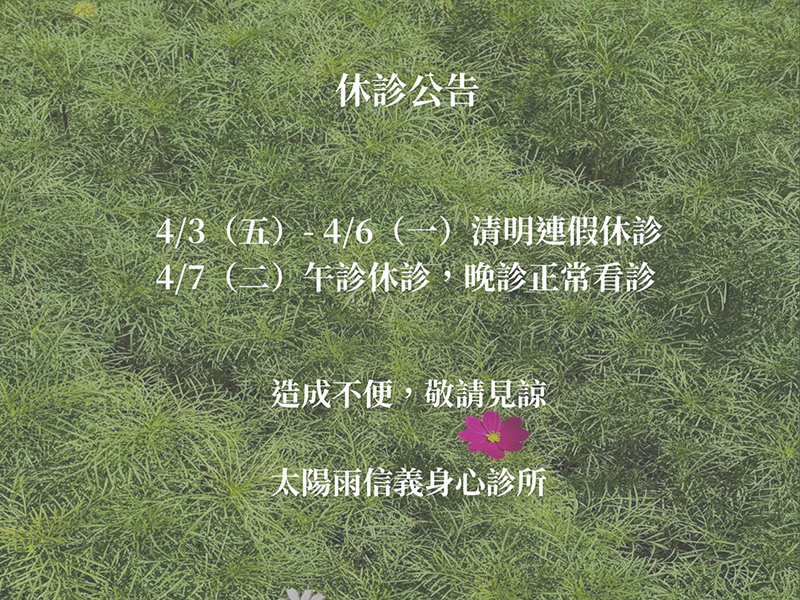 本診所將於 2026/4/3 - 2026/4/7 中午休診,2026/4/7 晚上恢復看診,造成不便敬請見諒